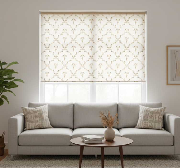 The Blind beige hexagonal floral design blind beige is the ideal decorative solution for any room! Its elegant floral pattern adds a touch of sophistication and warmth, making it a perfect fit for both modern and traditional interiors. This blind not only beautifies your space but also serves practical purposes, such as providing privacy and controlling light. Transform your home into a stylish retreat that showcases your unique taste!