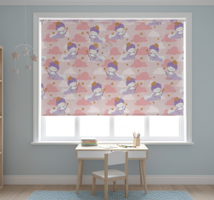 Reference: E6927Introducing the Blind children 80's magical little prince with crown, a whimsical roller blind that brings a touch of enchantment to any space! This delightful design features a charming little prince wearing a crown, surrounded by stars and magical elements that spark joy and imagination. The vibrant colors and playful graphics create a warm atmosphere, making it perfect for children's rooms or any area that needs a sprinkle of magic!