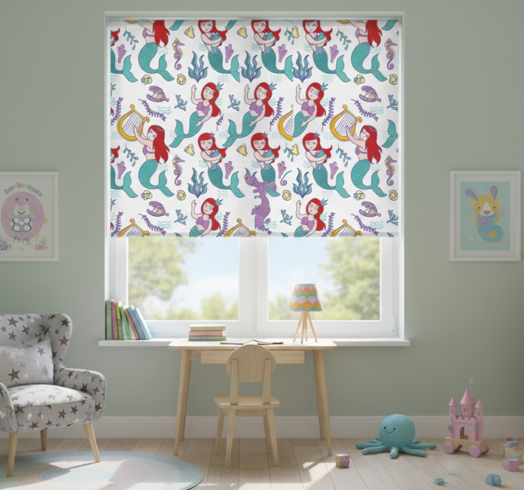 The Blind children mermaid ariel smiling blind children roller blind is a fantastic way to brighten up a child's room or play area. Its whimsical design inspires creativity and joy while providing a comforting and cheerful atmosphere. This unique decoration serves not just an aesthetic purpose but also helps create a magical environment where children can dream and explore their imaginations!