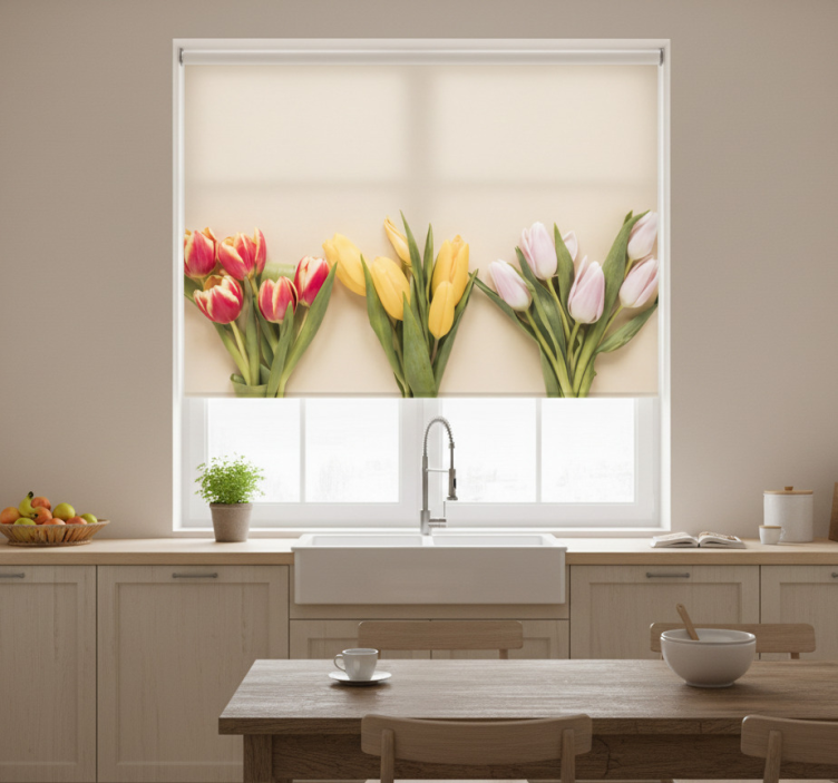 Blind kitchen in three different colors of flowers