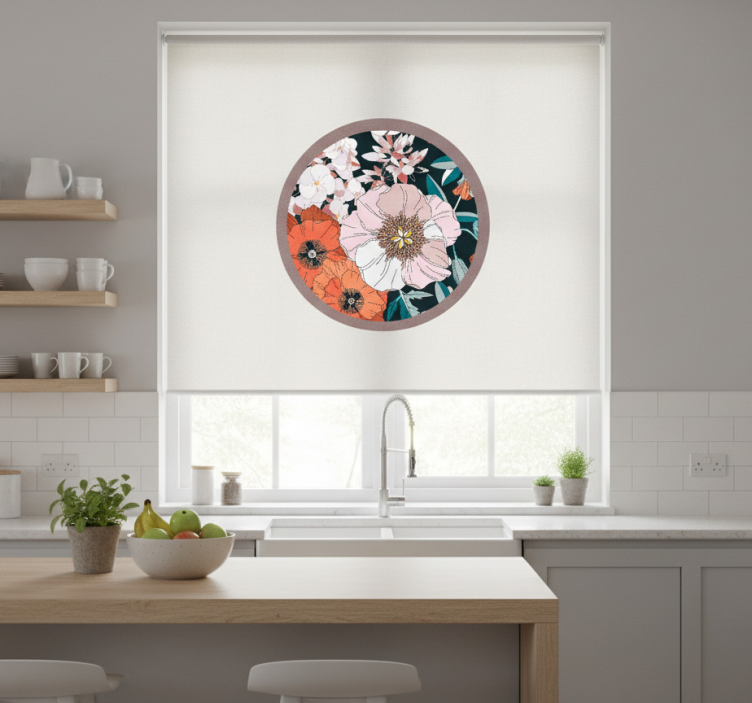 Reference: E8360Introducing our stunning Blind kitchen puppy flowers in a circle design! This captivating roller blind features a delightful arrangement of puppy flowers elegantly encased in a circular pattern, creating a charming visual that enhances any kitchen space. The vibrant colors exude joy and warmth, ensuring your kitchen feels inviting and cheerful. With easy assembly in just two clicks, this roller blind is not only beautiful but also incredibly practical, making it the perfect addition to your home!