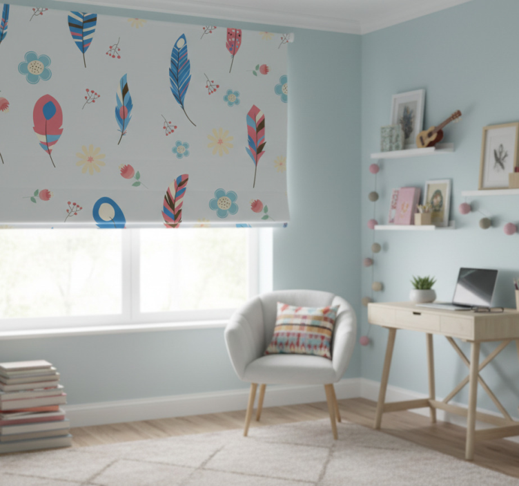 Reference: E7415Introducing our stunning Blind teens bohemian feather design, a beautiful blend of artistry and functionality! This design features exquisite feather patterns that evoke a sense of freedom and creativity, making it the perfect addition to any space. The vibrant colors and intricate details bring a bohemian flair, while the durable materials ensure longevity. With easy assembly in just 2 clicks, this roller blind is as practical as it is stylish!