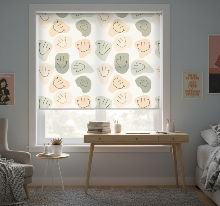 Reference: E7593Introducing our Blind teens simple neutral colors smiley faces, a delightful and cheerful addition to any room! This unique design features a playful array of smiley faces in soothing neutral tones, creating an inviting atmosphere. Perfect for brightening up a space, this roller blind is not only visually appealing but also functional, offering easy assembly in just two clicks, effortless cleaning, and the ability to provide privacy while allowing light to filter through beautifully.