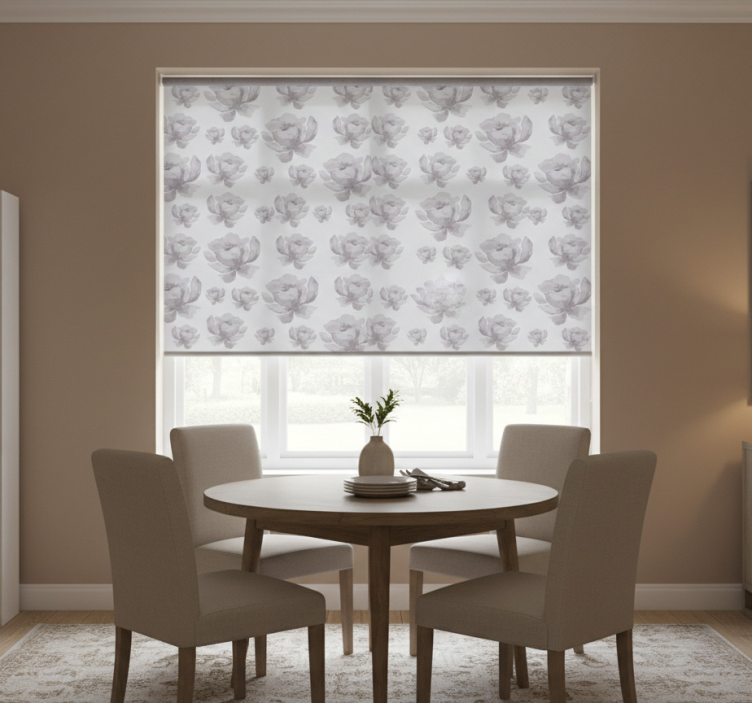 Dining room blind with gray 80s floral pattern