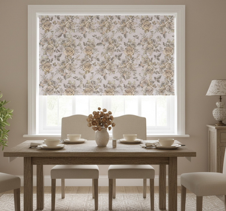 Reference: E6578Transform your living space with our Dining room blind with shabby chic rose design. Featuring a delightful floral pattern that combines elegance with a vintage touch, this roller blind brings a warm and inviting atmosphere to your dining area. The soft hues of the roses and the intricate details create a charming ambiance, making it an ideal choice for those who appreciate shabby chic aesthetics. Not only is it visually appealing, but it also offers practical benefits like easy assembly in 2 clicks, effortless cleaning, and the ability to control light and privacy.