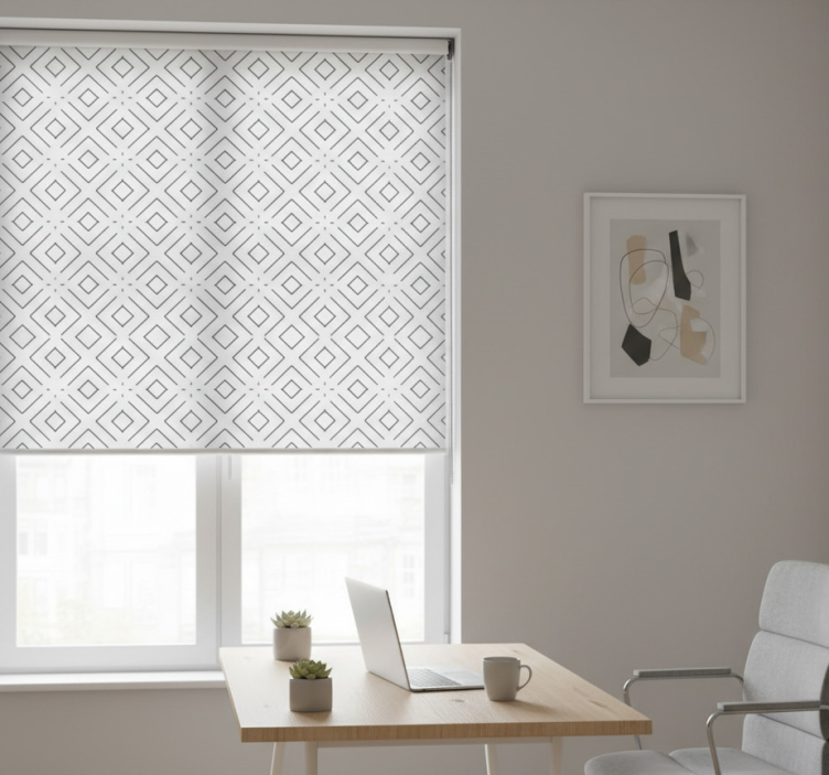 Home office blind with white geometric pattern