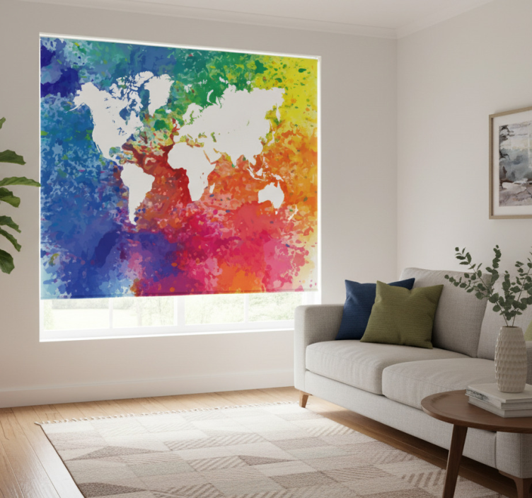 Reference: E8579Transform your living space with our Living room blind artistic colorful silhouette worldmap. This stunning design features a vibrant world map silhouette that adds a splash of color and artistic flair to any room. The intricate graphics not only enhance your decor but also create a warm and inviting atmosphere. With easy assembly in just two clicks, easy cleaning, and effortless disassembly, this roller blind is as functional as it is beautiful!