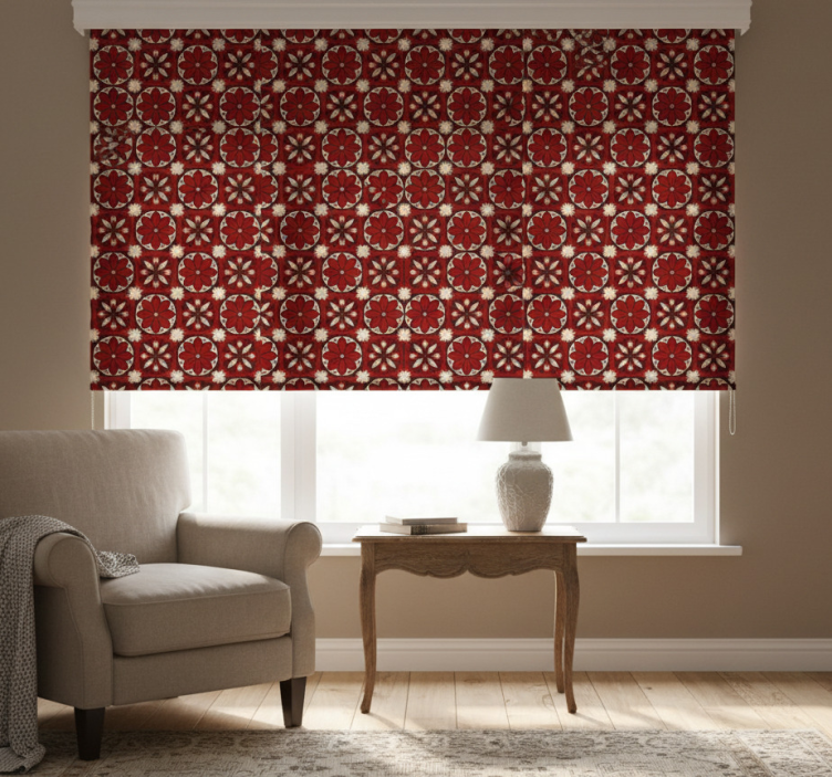The Red blind with vintage tile design red blind serves as a remarkable decorative element that enhances the ambiance of any room. Its unique design captivates attention and transforms a simple window into a stunning work of art! This roller blind not only elevates your interior decor but also adds a layer of warmth and personality, inviting compliments from guests and making your space truly memorable!
