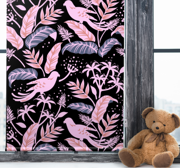 Transform your space with our stunning Tropical bird motifs animals blind, featuring vibrant birds dancing among lush leaves and delicate pink flora. This captivating design brings a touch of the tropics into your home, creating a lively and inviting atmosphere!