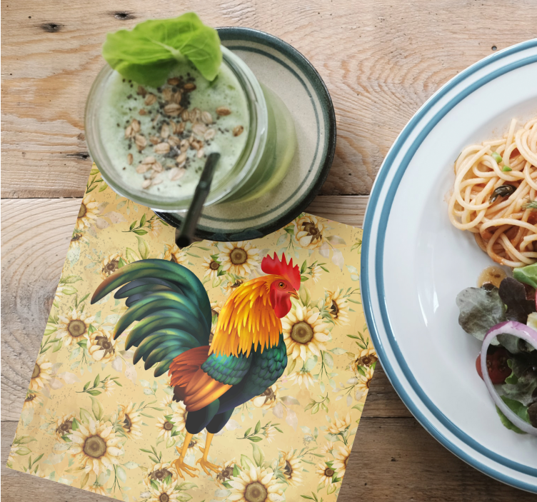 Reference: B3617A vibrant rooster is centrally placed amid a backdrop of sunflowers, creating a lively farm-inspired motif. The detailed plumage of the rooster showcases a spectrum of colors, enhancing its visual appeal. This design captures the essence of rustic charm and nature's beauty.