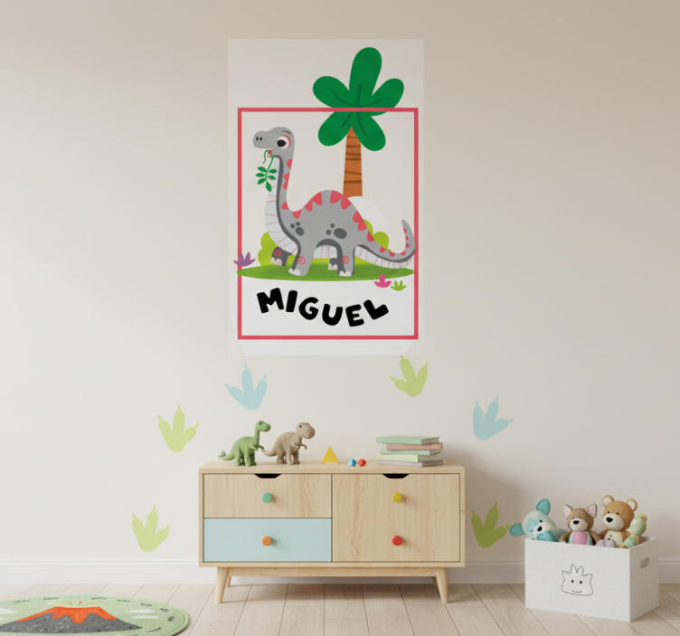 Reference: G963Introducing our stunning Nursery poster gray long neck dinosaur, designed to bring joy and imagination to any child's space! The charming gray long neck dinosaur illustration features a semi-matt finish that ensures a glare-free viewing experience while showcasing high color intensity that captivates the eyes. Made from 180g/m2 grammage, this poster is ideal for any nursery decor, making it a must-have addition to your child's room!