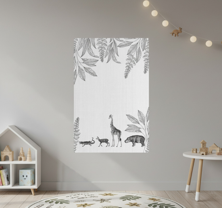 Reference: G941Introducing our enchanting Nursery poster with safari animals and trees border, designed to bring a touch of adventure and whimsy to your child's room! This beautiful poster showcases a vibrant array of safari animals surrounded by a delightful tree border, creating a captivating scene that inspires imagination and joy. With a stunning semi-matt finish that enhances color intensity and a sturdy 180g/m2 grammage, this poster is perfect for your nursery decor.