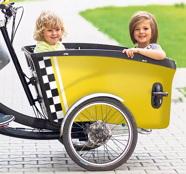 Introducing our vibrant Bike sticker yellow taxi design! This playful design features a charming yellow taxi graphic, perfectly suited for cargo bikes, or bakfiet, adding a fun touch to your cycling adventures. It's designed with children in mind, transforming any ride into an exciting transport experience. Let your little ones enjoy the thrill of their very own taxi cab as they pedal around!