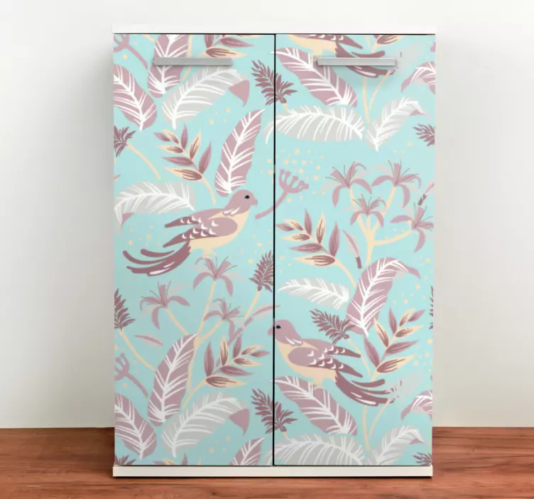 The Furniture sticker botanical bird design is a stunning visual treat, featuring delightful birds and parrots nestled among an array of lush leaves. This exotic and tropical design bursts with pastel colors that create a serene atmosphere in any space. With its rich flora and fauna elements, this pattern brings the beauty of nature indoors, transforming ordinary furniture into a captivating decorative statement that radiates charm and elegance.