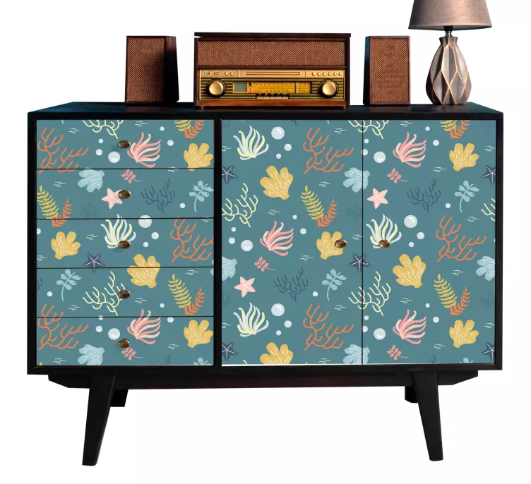 Transform your space with our stunning Furniture sticker coral reef design, a vibrant representation of underwater beauty! This design showcases an enchanting world of sealife, featuring colorful coral patterns, playful starfish, and delicate plants surrounded by whimsical bubbles. The combination of marine elements creates a captivating atmosphere that brings a touch of the ocean right into your home, making every glance a refreshing escape into the depths of the sea!