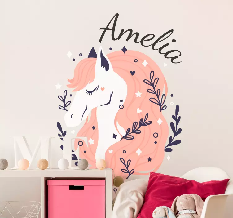 Transform your teenager's room with this cute horse head design illustration that can be customized with a personalized name. Perfect for kids who love horses, this wall decal is an ideal bedroom decoration that can also be used in the playroom, nursery or schoolyard. Made with high quality vinyl, it doesn't create air bubbles when applied.