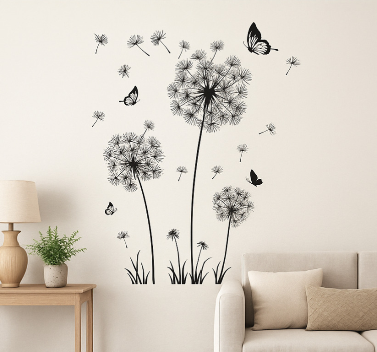 Reference: A54035Transform your living space with our stunning Living room wall sticker dandelion butterfly design. This artistic creation features whimsical dandelions and delicate butterflies, adding a touch of nature's beauty to your walls. The intricate details and vibrant colors create a captivating focal point that can breathe life into any room. Whether you're aiming for a serene ambiance or a lively atmosphere, this design perfectly complements various interior styles.