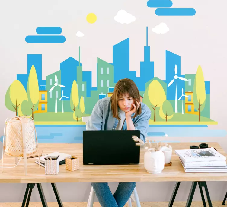 Introducing our stunning Location sticker modern urban landscape, a captivating design that beautifully illustrates a vibrant cityscape. Featuring a striking silhouette of skyscrapers, intricate buildings, lush trees, serene water, and eco-friendly wind turbines under a radiant sun, this illustration brings the essence of urban life right into your space. Transform your walls into a breathtaking landscape that inspires and invigorates!