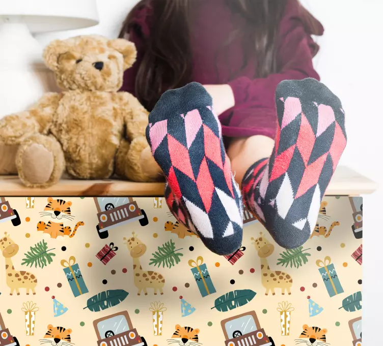 Reference: A51645A whimsical collection highlights playful safari elements, featuring giraffes, tigers, and colorful gifts. This design enhances a child's playful spirit with its vibrant representation of a fun, adventurous theme that's perfect for lively spaces.