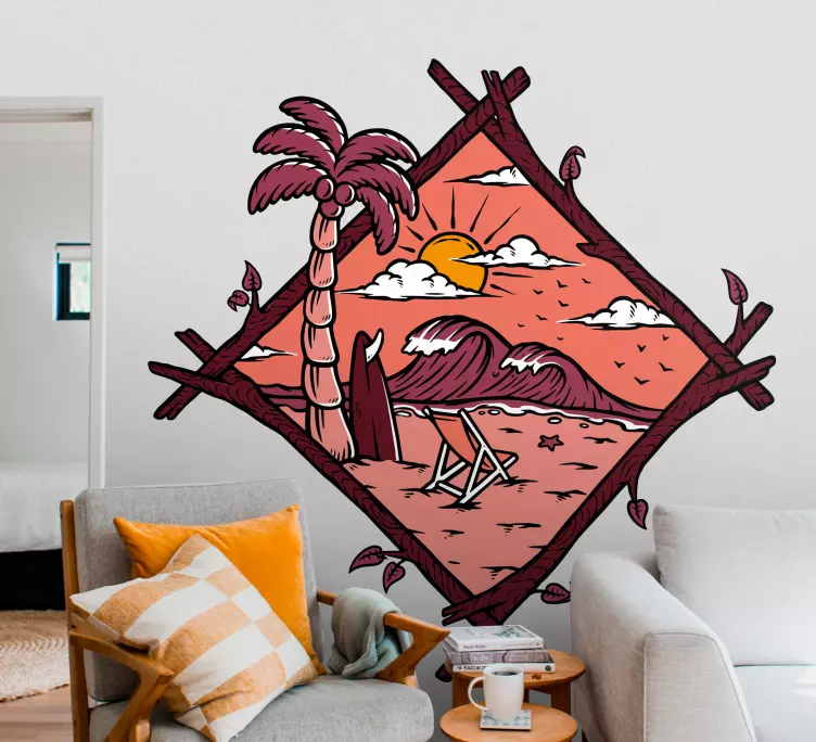 Transform your space with our stunning Nature wall sticker tropical beach scene, featuring a breathtaking graphic design that captures the essence of a lonely surfer riding the waves at sunset. This captivating drawing showcases palm trees swaying in the gentle breeze, a relaxing beach chair waiting for you, and majestic mountains in the background, all combining to create a tropical paradise that invites serenity and peace into your home.
