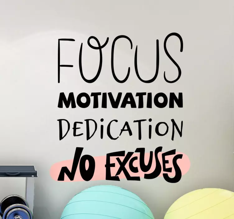 Looking for a little extra inspiration to power through your day? Look no further than our stunning motivational wall sticker featuring the powerful text 'focus, motivation, dedication, no excuses' in a variety of cool fonts. The black text is accented with a bold pink paint swipe over the final phrase, making it a visually striking addition to any room in your home or office.
