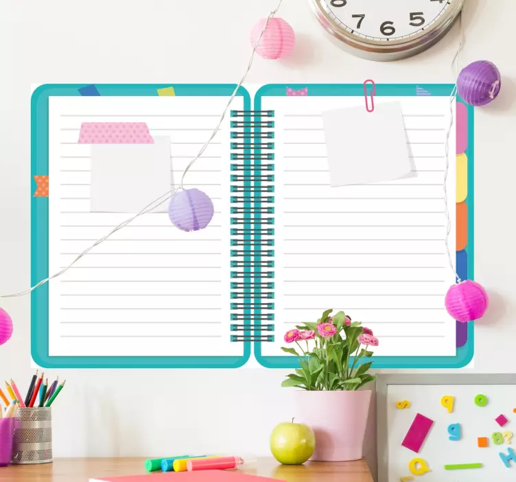Reference: A9024Get yourself organised with this great sticker! Apply easily to your wall and draw on it freely with the pen provided. Make note of your important reminders and appointments, much more effective than pen and paper! A decorative design of a notebook with different coloured tabs. Ideal for bedrooms or office spaces.