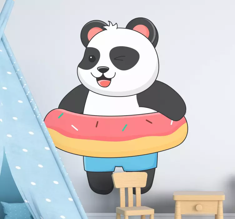Reference: A46909A playful panda character is depicted enjoying a donut, exuding a cheerful vibe. The charming design features bright colors and a humorous expression, making it perfect for children's spaces. This design evokes feelings of joy and fun, ideal for creating a lively atmosphere.