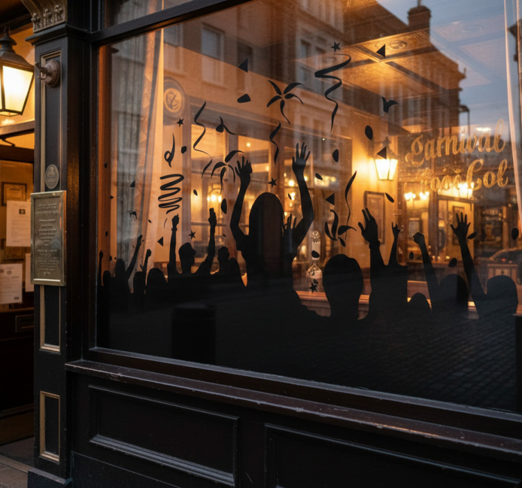 Transform your space with our Shop window sticker celebrating carnival crowd shop window sticker! This vibrant decoration adds an uplifting spirit and a sense of joy, making it perfect for festivals, parties, or any cheerful gathering. Its lively imagery invites customers to engage and experience the festive joy, creating an inviting atmosphere that encourages foot traffic and boosts sales!