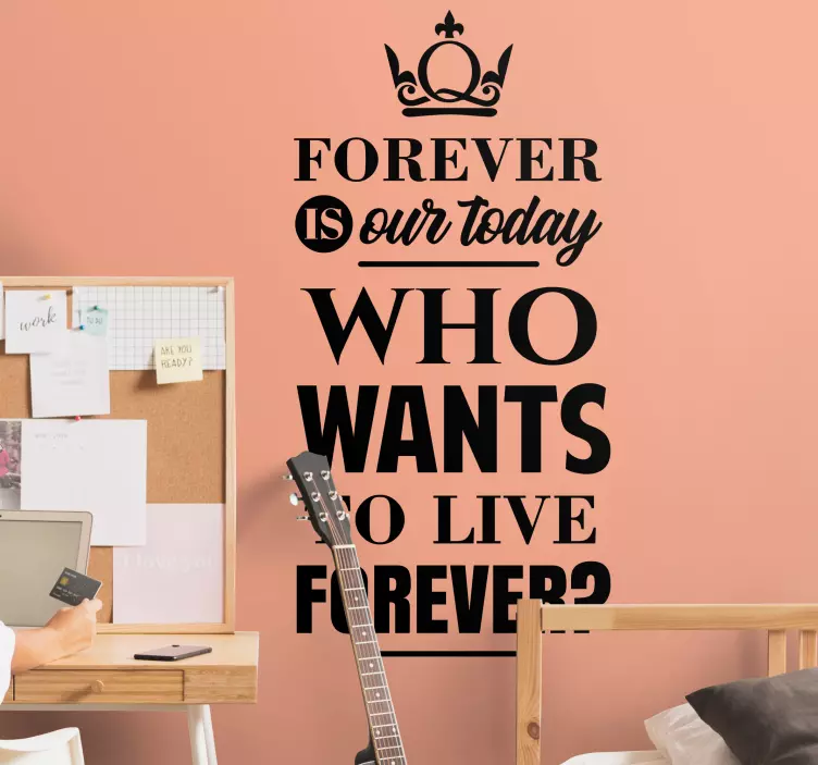Introducing our captivating Text sticker who wants to live forever, a stunning blend of monochrome typography and musical inspiration! This unique design features lyrics that resonate with the desire to live eternally, making it the perfect addition to your living space. The bold quote serves as a reminder to embrace every moment, bringing a touch of creativity and passion to your home.