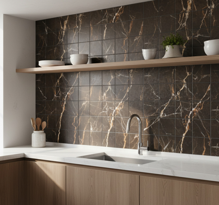 Reference: A54982Transform your space with our stunning Tile sticker black and golden marble design. This exquisite design features a rich black base adorned with elegant golden marble veining, creating a luxurious and sophisticated look. Perfect for kitchens, bathrooms, or any area that needs a touch of glamour, this tile sticker seamlessly blends modern aesthetics with timeless elegance.