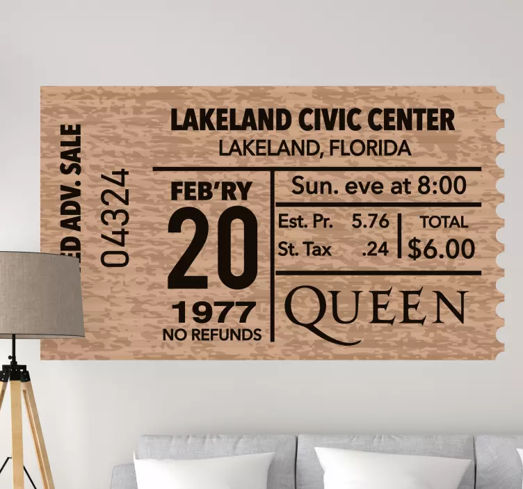 Transform your space with our Wall sticker lakeland civic center ticket, a stunning visual piece that captures the essence of a concert experience! This design elegantly features a ticket motif, seamlessly integrating elements of date, event, and music, all while paying homage to the legendary band Queen. It’s perfect for music lovers and adds a unique flair to any room!