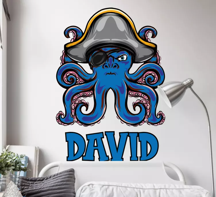 Transform your space with our stunning Wall sticker pirate octopus character! This whimsical design features a playful octopus dressed as a pirate, complete with a custom name option to add a personal touch. The illustration combines vibrant blue hues to create a delightful atmosphere that sparks imagination and joy!