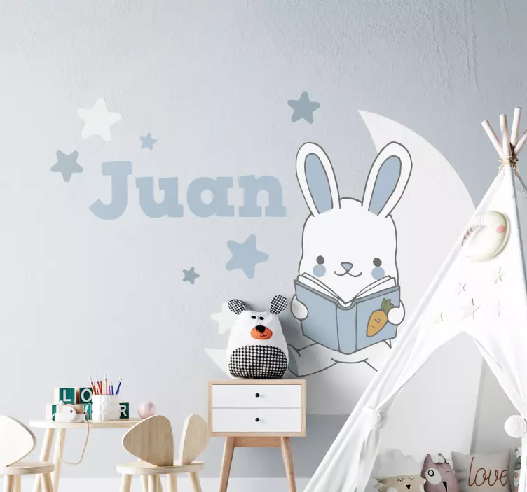 Reference: A51047A whimsical design featuring a charming bunny reading a book, surrounded by stars and a crescent moon. Perfect for personalizing a child's space, this playful theme encourages young readers and adds a touch of magic to the room.