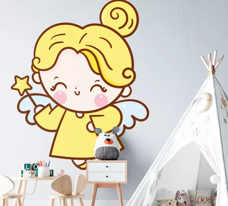 Transform your child's room into a magical space with our Wall stickers for kid cute angel character. This enchanting design features a whimsical fairy angel character, complete with a wand and a bright yellow palette. With a charming smile, this child-friendly and playful design will inspire joy and creativity, making it the perfect addition to any child's room!