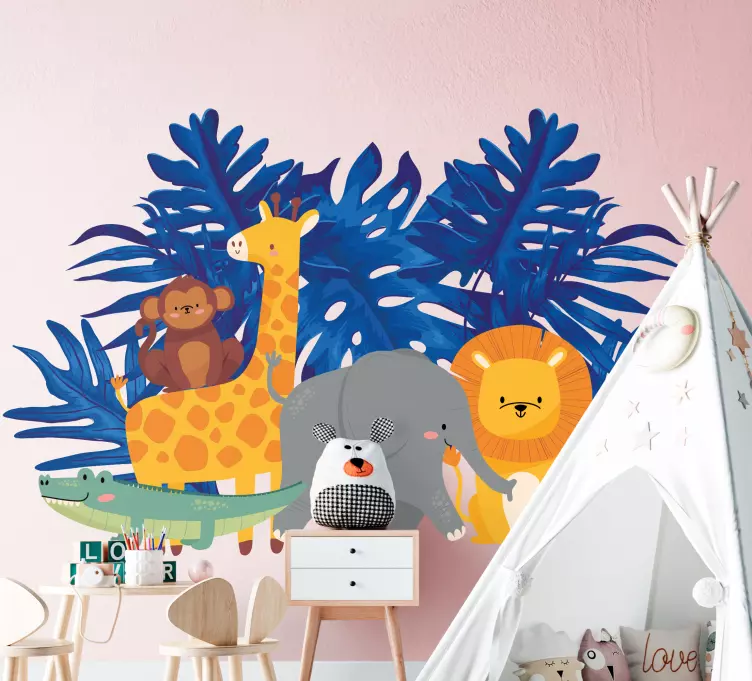 Transform your child's room into a vibrant jungle adventure with our Wall stickers for kid playful animal jungle. This delightful design showcases a variety of cute animals including a playful monkey, a tall giraffe, a majestic lion, a friendly elephant, and a sneaky crocodile, all surrounded by lush green leaves. The colorful and fun graphics create a wild atmosphere that will spark your child's imagination and bring joy to their space!