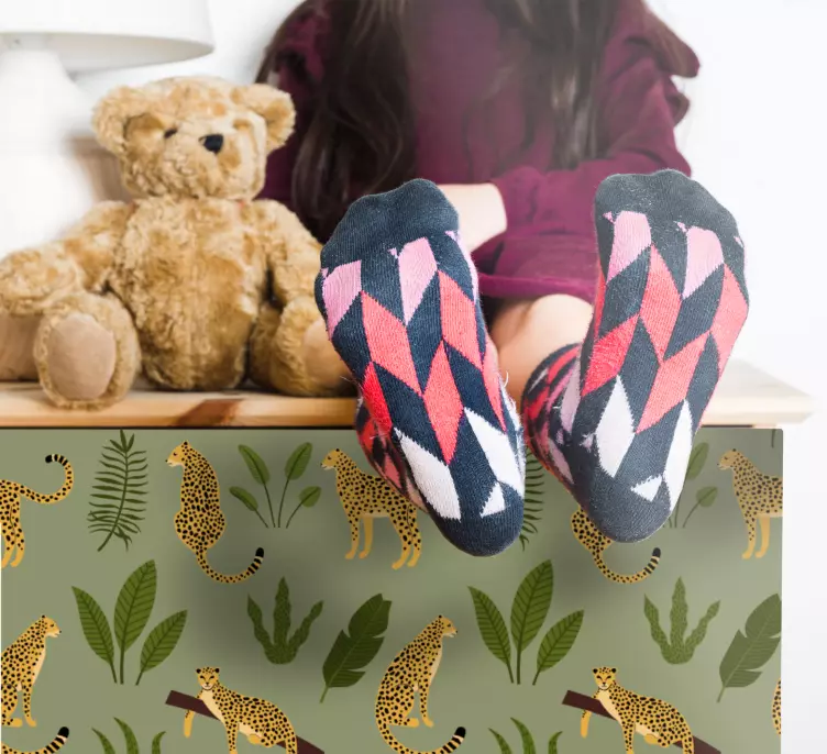 Transform your space with our Wild animal sticker leopard print jungle, a stunning design that captures the essence of the jungle. Featuring a vibrant leopard pattern intertwined with lush green leaves and tropical floral elements, this sticker brings the beauty of wildlife and nature into your home. Perfect for adding a touch of exotic charm to your furniture, this eye-catching surface design is sure to elevate any room!