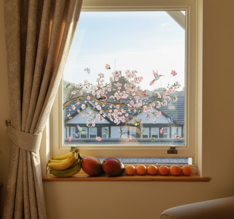 Reference: A53277Transform your space with our stunning Window sticker cherry blossom with birds. This exquisite design features delicate cherry blossoms intertwined with graceful birds, creating a serene and enchanting atmosphere. The vibrant colors and satin finish ensure that you can enjoy the beauty without any distracting glare. Made from high-quality materials, this sticker is easy to clean and offers a durable solution for your decorating needs.