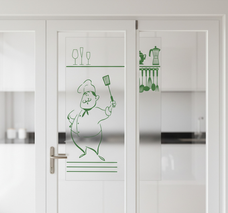 Reference: A53844Transform your kitchen space with our Window sticker head chef kitchen set. This delightful design features charming chef illustrations and kitchen essentials that bring warmth and creativity to your culinary environment. Made with a satin finish, this sticker ensures excellent color intensity without the hassle of glare, making it perfect for any window or flat surface!