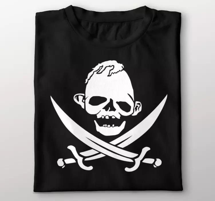 Reference: T4941This eye-catching design features a creepy pirate skull with a mischievous grin and crossed swords. Set against a bold black backdrop, the striking white graphics evoke Halloween themes, making it perfect for fun and playful occasions. Ideal for those who love adventurous styles.