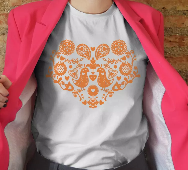 The Heart pattern birds t-shirt features a stunning design that beautifully blends polish with elements of folklore. This artistic creation showcases an array of flowers and birds, intricately arranged in a traditional style that celebrates love and nature. The floral patterns are ornate, captivating the eye with a harmonious interplay of heart shapes rendered in striking black and white.