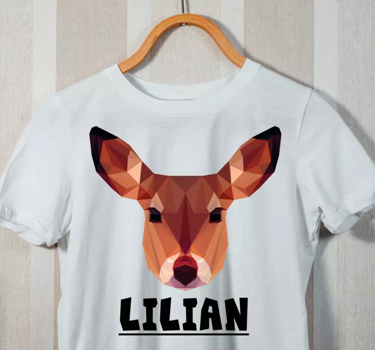 Introducing our Stylish deer head t-shirt, featuring a captivating graphic design that combines geometric shapes and a charming cartoon reindeer face. This polygonal artwork showcases the beauty of the animal world, allowing you to express your love for nature in a fashionable way. Plus, you can personalize it with your custom name, making it a unique addition to your wardrobe!