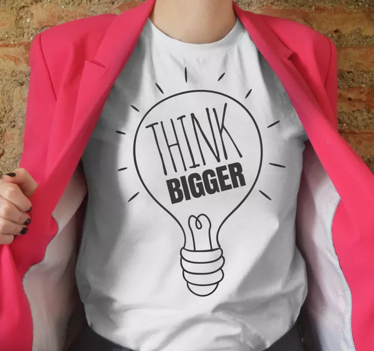 This shirt features a simple drawing of a lightbulb with the text 'Think Bigger'. The design is also available in hoodie format. Light up your outfit with this versatile product that is easy to wear and wash. Simply put it in the washing machine and turn it inside out for best results.