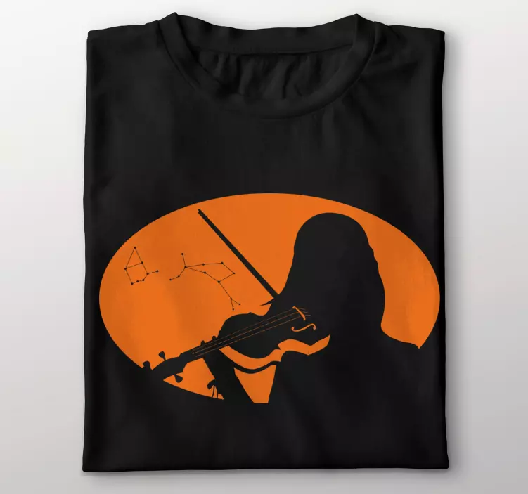 Immerse yourself in the enchanting world of music with our Violinist under stars t-shirt. This stunning design features a graceful violinist silhouette against a backdrop of twinkling constellations, beautifully illustrated in shades of orange and black. The musical essence of this classical piece will resonate with musicians and music lovers alike, making it a perfect addition to your wardrobe!
