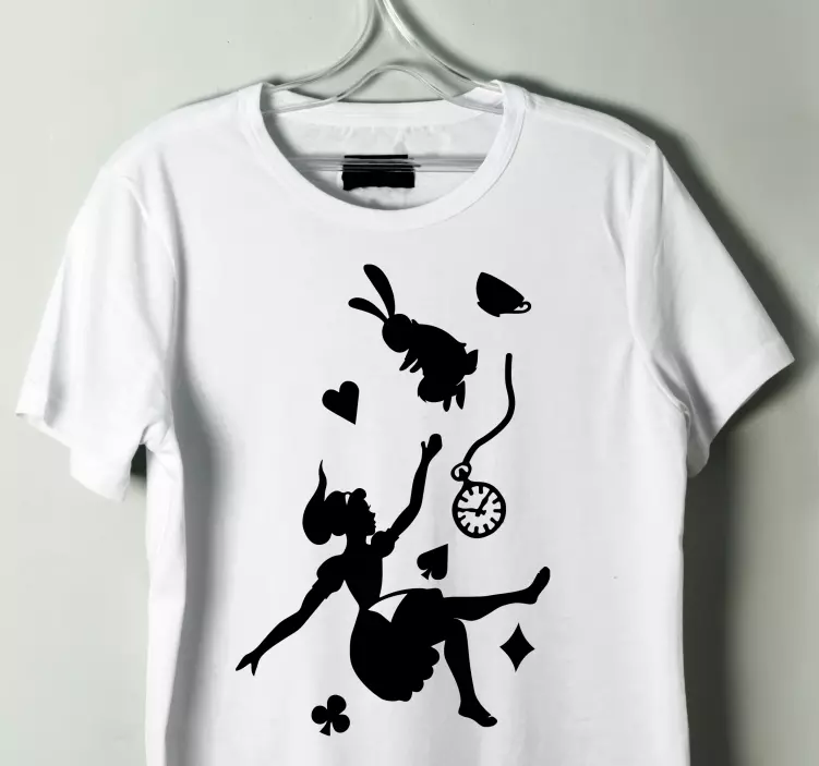 Step into a world of imagination with our Whimsical tea party fun kids t-shirt! This delightful design features enchanting elements like a playful rabbit, silhouettes of characters from Alice in Wonderland, a charming falling pocket watch, and whimsical hearts that capture the essence of a fantastical tea party. The vibrant graphics invite kids to join a magical adventure, perfect for young dreamers!