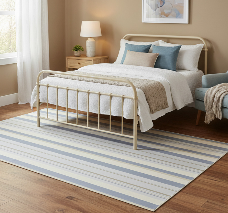 Transform your space with the enchanting 80's blue and beige stripes bedroom vinyl rug! This beautiful bedroom vinyl rug is not just a décor item; it's a statement piece that adds character and warmth to any room. Imagine the lively ambiance it brings, making your bedroom a delightful haven where you can unwind and express your unique style!