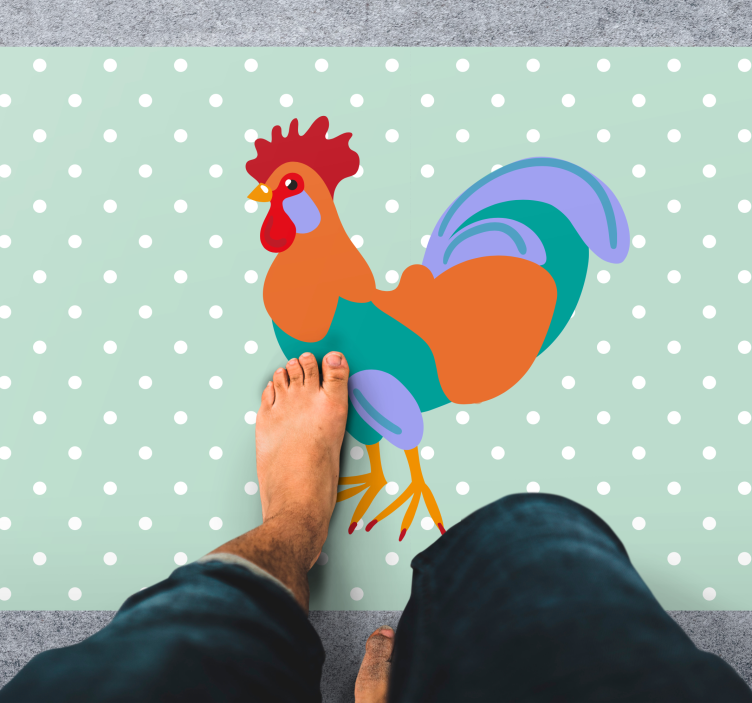 Transform your space with our stunning Animal vinyl rug with vibrant rooster design, featuring a delightful rooster illustration complemented by a playful pattern background adorned with colorful dots and polka dots. This cartoonish and vibrant design adds a cheerful touch to any room, making it a perfect focal point for your decor!
