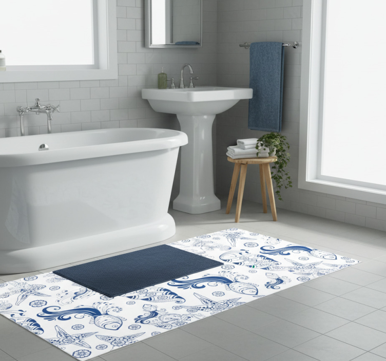 Enhance your bathroom's aesthetic with the stunning Bathroom vinyl rug ornamental sea life design bathroom vinyl rug. This eye-catching piece not only serves a practical purpose but also elevates the overall decor. The unique sea life patterns evoke a sense of calm and relaxation, making your bathroom a perfect retreat. Embrace the beauty of the ocean every day as you step onto this delightful rug!