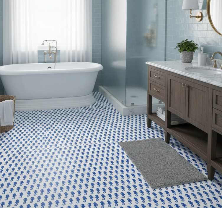 Reference: R23553Transform your bathroom into a serene underwater paradise with our Bathroom vinyl rug sea horse shower mat. This stunning shower mat features an enchanting seahorse design complemented by vibrant colors and intricate details that bring a touch of oceanic elegance to your space. Made from high-quality materials, it's not only visually appealing but also practical, offering scratch resistance and thermal insulation to ensure comfort and safety.