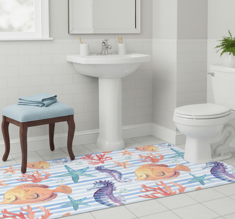 Caring for your Bathroom vinyl rug sea life tiles design bathroom vinyl rug is a breeze! Simply wipe it down with a damp cloth or use mild soap for tougher stains. Its durable surface ensures that it remains vibrant and functional, making it a practical choice for any busy household.