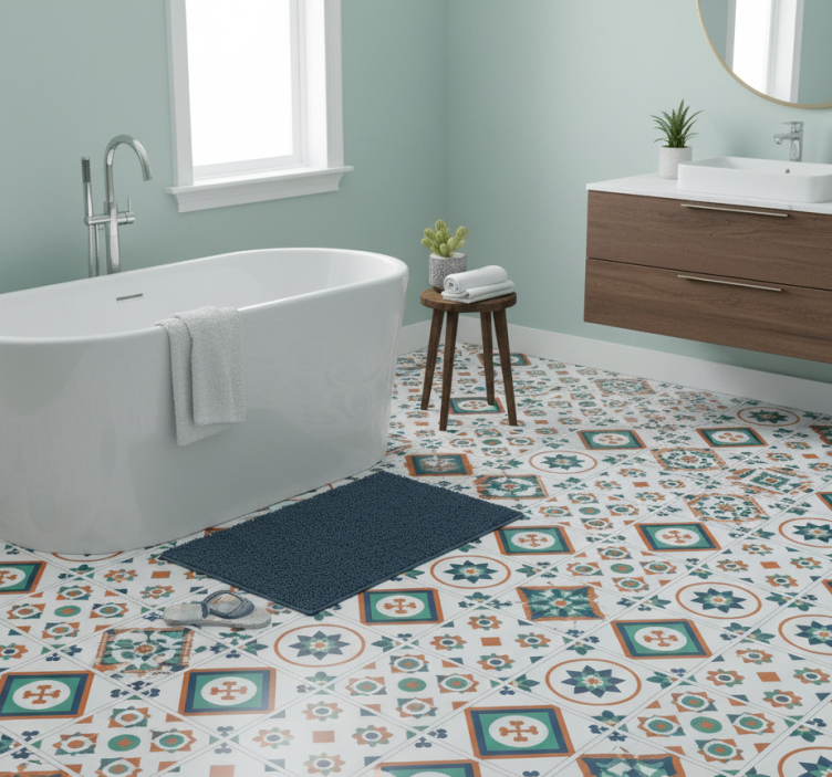 Elevate your interior design with the Bathroom vinyl rug with geometric tiles design bathroom vinyl rug. Its unique geometric patterns serve as a vibrant focal point, breathing life into your bathroom while complementing various decor styles. This rug not only enhances visual appeal but also protects your floors, making it a perfect addition to any home looking for both style and functionality!